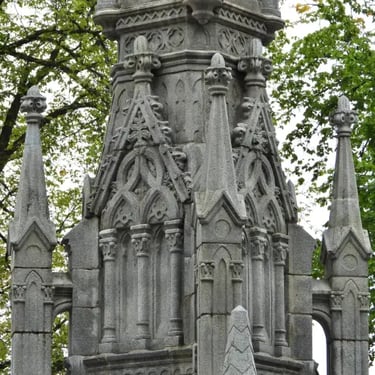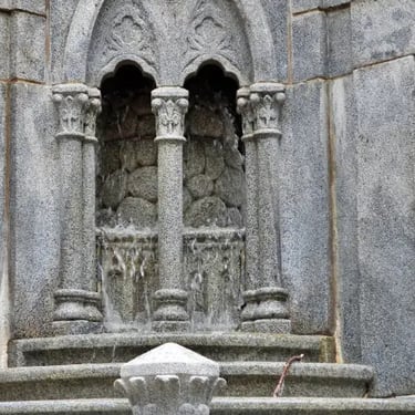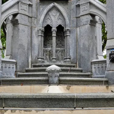Il est façonné dans le style néo-gothique et comprend une statue de la Vierge Marie placée sur un piédestal décoré de motifs religieux et de plaques commémoratives.