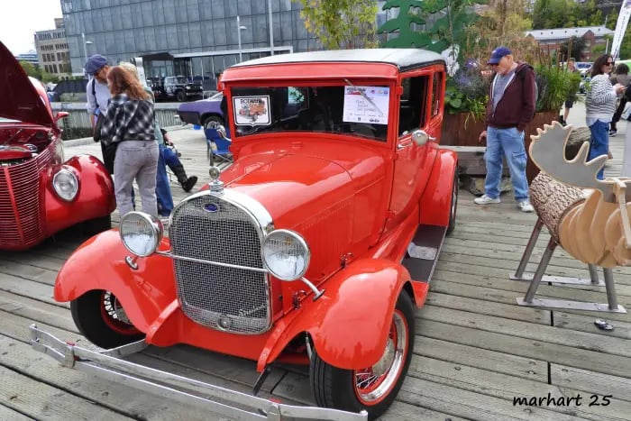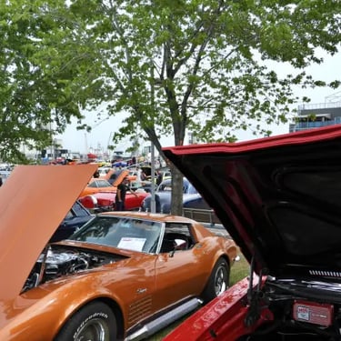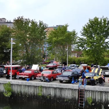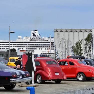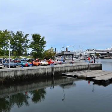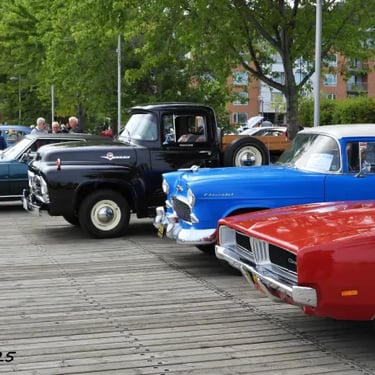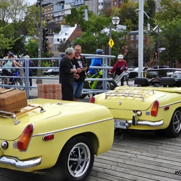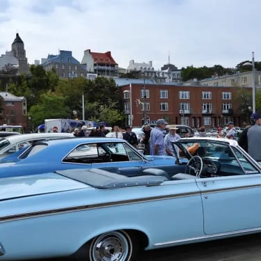 Une partie de la rue St-Paul et du Vieux Port de Québec s'éveillent, avec des automobiles anciennes minutieusement rénovées, allant des modèles mythiques des années 1920 aux emblématiques voitures de muscle des années 1970.